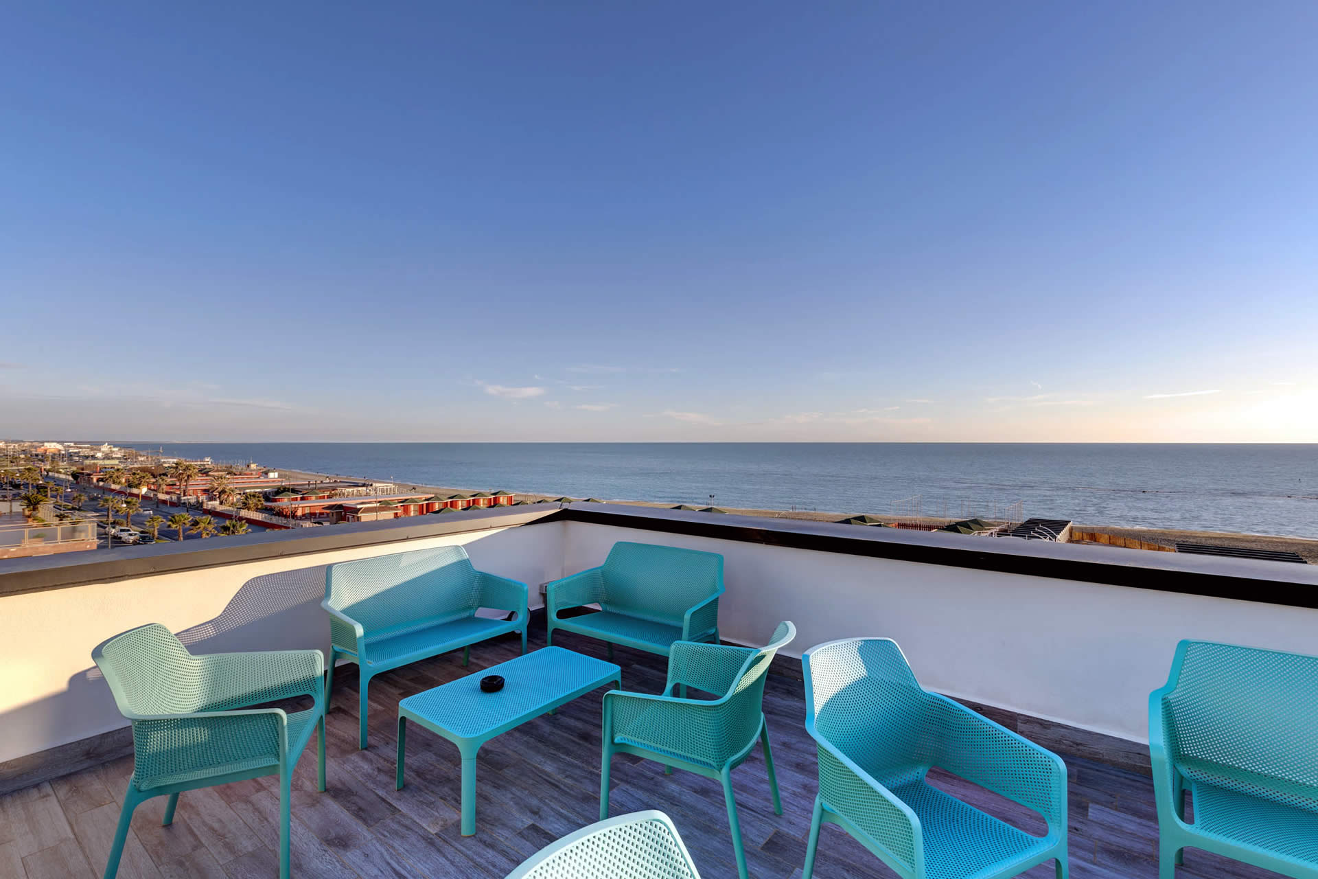 Riservata esclusivamente agli ospiti dell'hotel, la terrazza panoramica all'ultimo piano regala un'esperienza unica con vista sul mare.